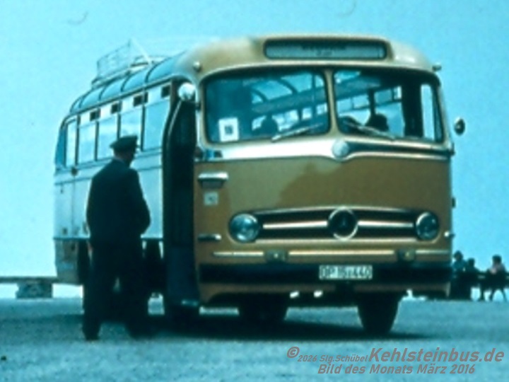 Ein 1956 beschaffter Mercedes O 321 auf der Kehlsteinwendeplatte, Deutschlands höchstgelegene Omnibusendhaltestelle. Noch bis 1978 wurden gelbe Busse des Postreisedienstes dort eingesetzt, dann erst fuhren da die ersten orangefarbenen RVO Busse.