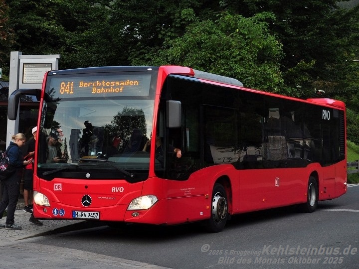 In den Jahren 2013 u. 14 wurden zwei Lieferungen des Mercedes Benz Citaro C2Ü für die Kehlsteinlinie in Dienst gestellt. Lange nach dem harten Einsatz am Berg werden die Busse noch weiterhin für den RVO im Berchtesgadener Land eingesetzt. Am 26.August 2025 konnte Simon Bruggeling den Wagen 9457 an der Haltestelle in Schönau (am Königssee) in der Jennerbahnstraße ablichten. Vielen Dank an meinen Hobbykollegen aus den Niederlanden für dieses tolle Bild.